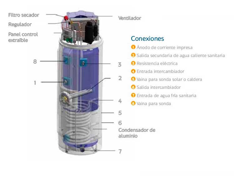 - Para empezar, está formada por un acumulador de agua vertical y una bomba de calor encima de ella.